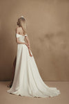 Cole is a graceful and stylish wedding dress. The neckline with lowered shoulders is embellished with falbala and soft folds which pass to the back of the dress and create an uncovered back neckline. The corset and waist area are decorated with folds and draping. A stylish wrap skirt with a high slit on one leg has a straight cut and detachable overskirt with a long train that can be fixed on the bride's waistline.